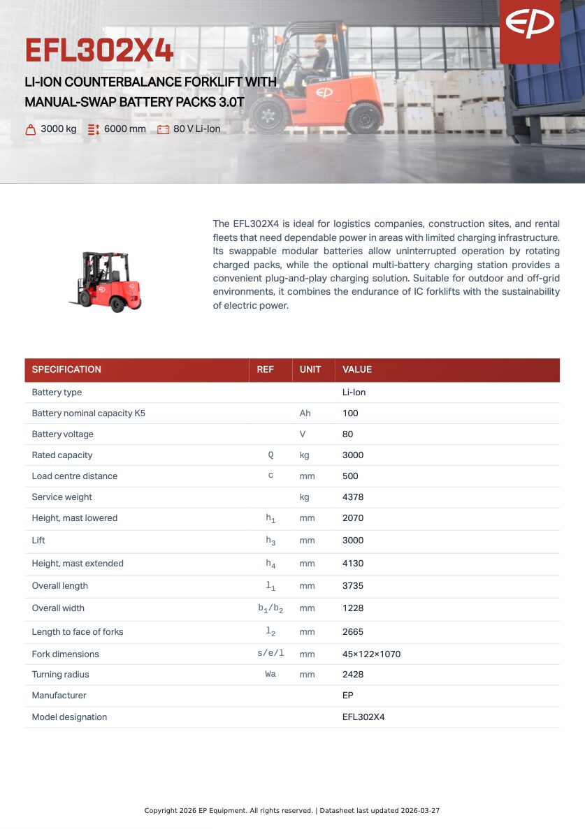 EFL302X4 är en elektrisk motviktstruck / gaffeltruck framtagen för verksamheter som kräver maximal flexibilitet och drifttid – även där tillgång till laddning är begränsad. Med en lyftkapacitet på 3000 kg och ett innovativt batterisystem är den idealisk för logistik, byggarbetsplatser, uthyrning och off-grid-applikationer.