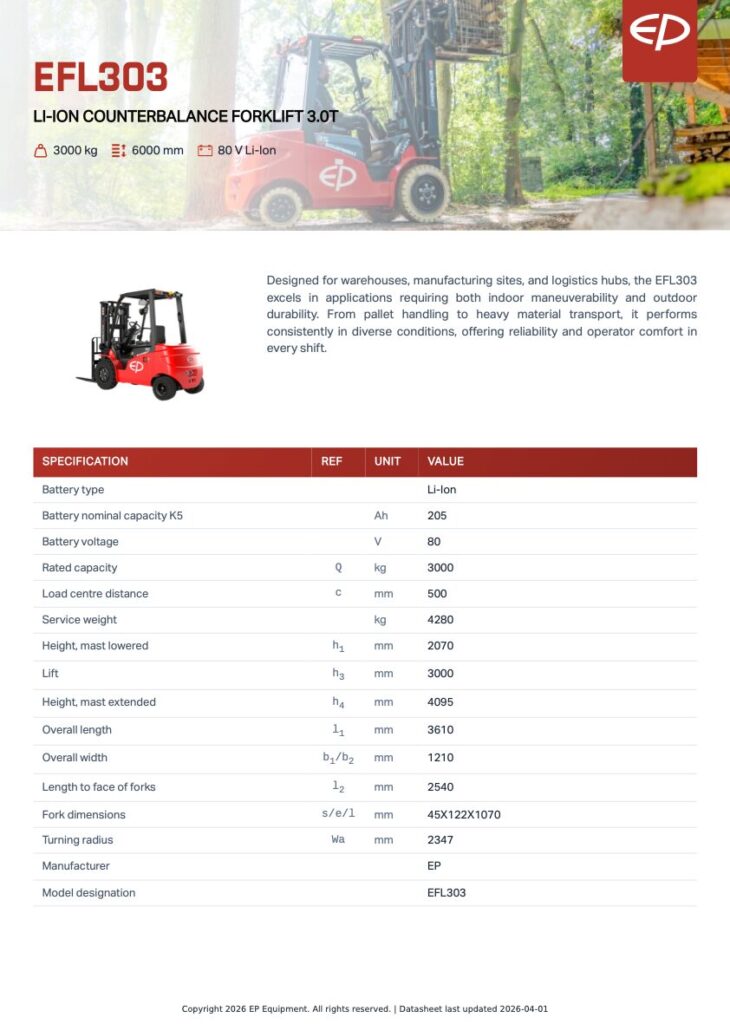 EP Motviktstruck EFL303 – 3000 kg, Litium