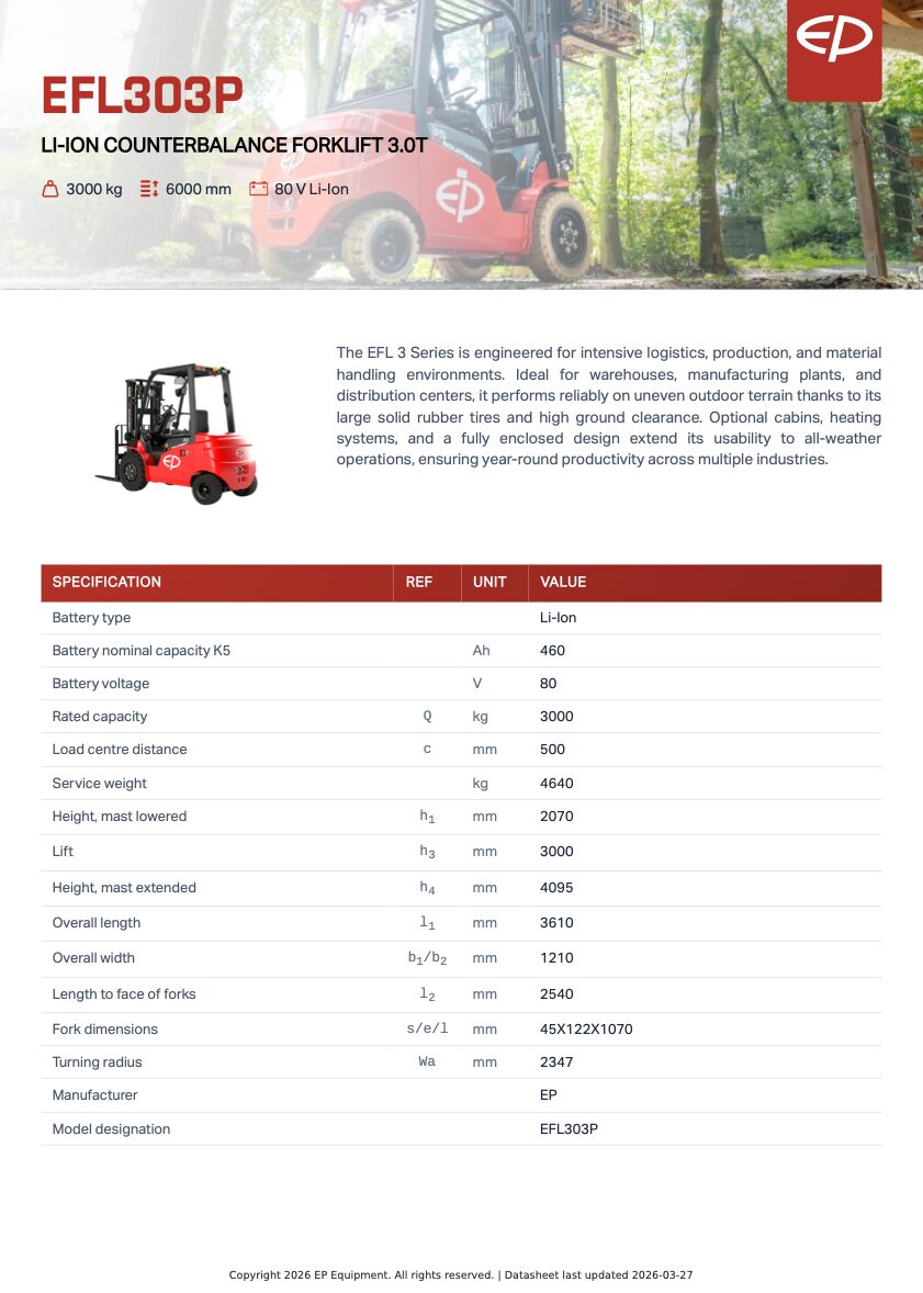 Kontakta för offert. EP EFL303P är en elektrisk motviktstruck (gaffeltruck) med litiumbatteri, 3000 kg lyftkapacitet och upp till 6000 mm lyfthöjd, utvecklad för intensiv drift inom lager, industri och utomhusmiljöer. Med kraftfullt 80V batteri (upp till 460Ah), hög prestanda och robust konstruktion är den optimal för fler-skiftsdrift och krävande materialhantering.