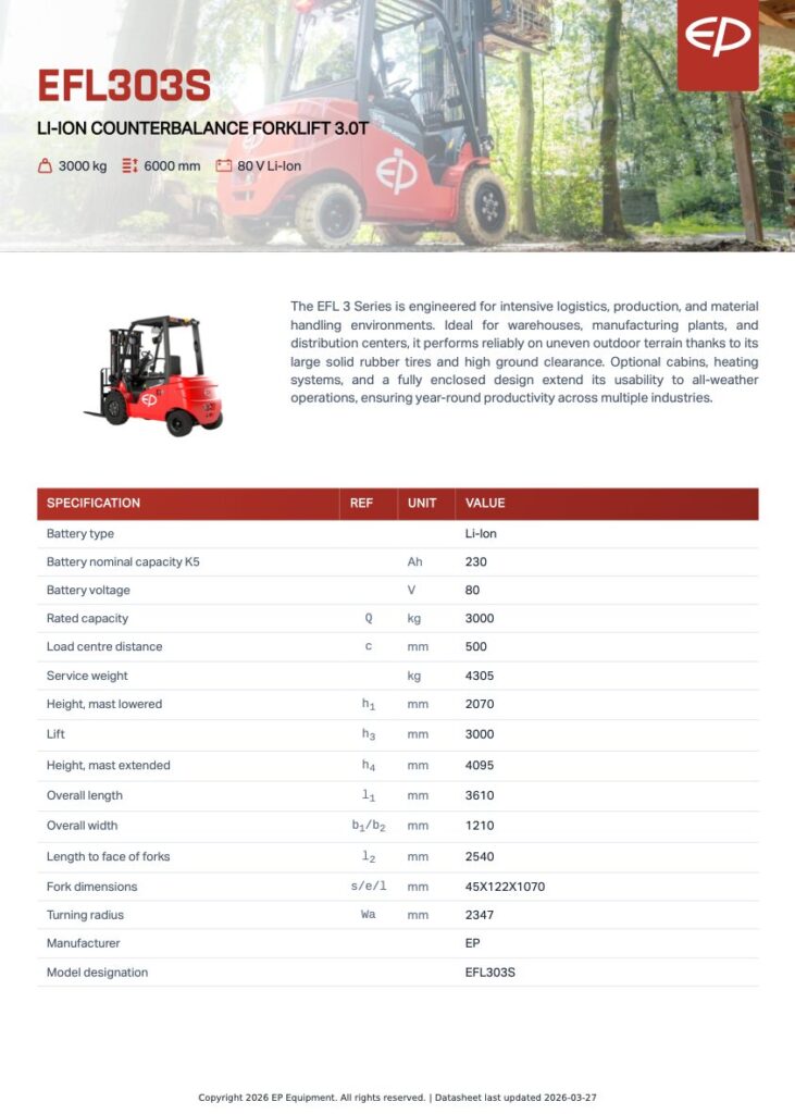 EFL303S är en elektrisk motviktstruck / gaffeltruck framtagen för verksamheter som behöver en driftsäker och kostnadseffektiv truck för både inomhus- och utomhusarbete. Med en lyftkapacitet på 3000 kg är den idealisk för lager, produktion, logistikcenter och lättare till medeltung materialhantering.