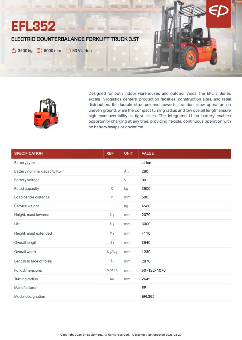 Kontakta för offert. EP EFL352 är en elektrisk motviktstruck (gaffeltruck) med litiumbatteri, 3500 kg lyftkapacitet och upp till 6000 mm lyfthöjd, utvecklad för tung materialhantering inom lager, industri, bygg och logistik. Med kraftfull 80V drift, robust konstruktion och hög manövrerbarhet är den optimal för både inom- och utomhusbruk.