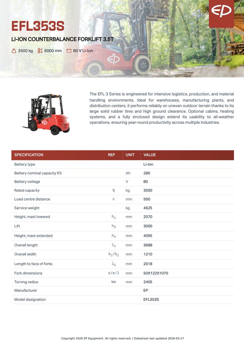 EFL353S är en elektrisk motviktstruck / gaffeltruck framtagen för verksamheter som behöver en driftsäker, flexibel och kostnadseffektiv truck för både inom- och utomhusarbete. Med en lyftkapacitet på 3500 kg är den idealisk för lager, produktion, logistikcenter och materialhantering i varierande miljöer.