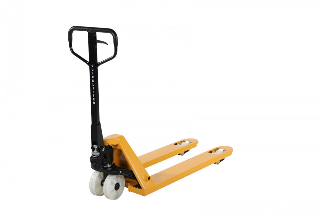 Palldragare Quicklift – 2500 kg med snabblyftfunktion upp till 150 kg. Ergonomisk och robust gaffelvagn med avrundade gaffelspetsar och 230° svängradie. Boggi/nylon-hjul för smidig och säker pallhantering.