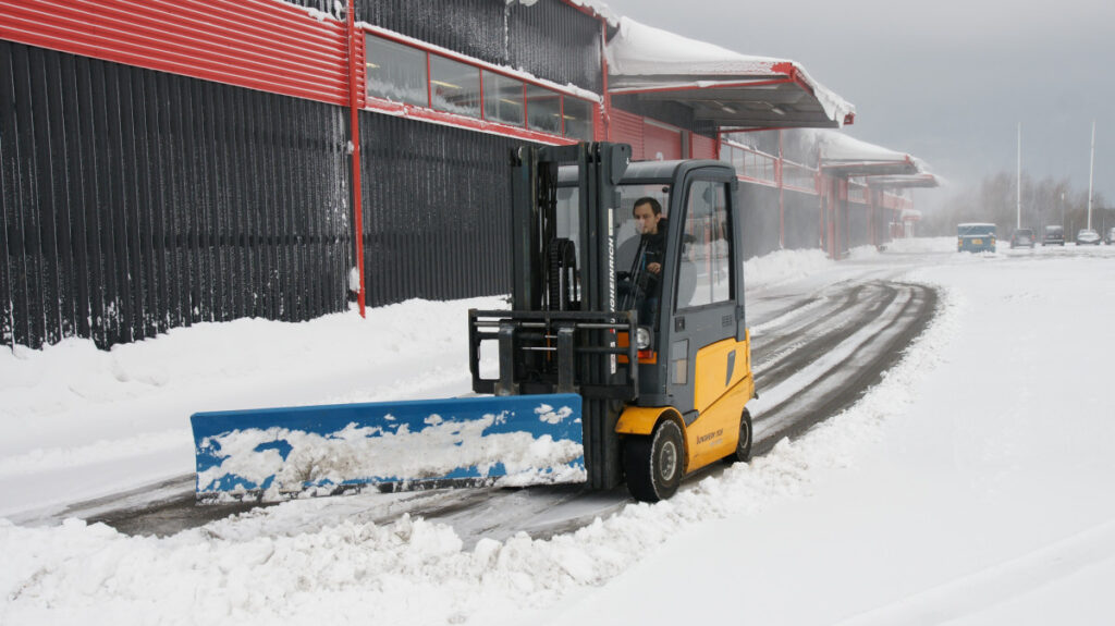 Snöplog med gummi – 2000 mm för truck. Pulverlackerad stålkonstruktion med utbytbar gummikant för lång livslängd. Plogen är ställbar i tre lägen (höger, vänster, rakt) och utrustad med gaffellås för säker och smidig hantering.
